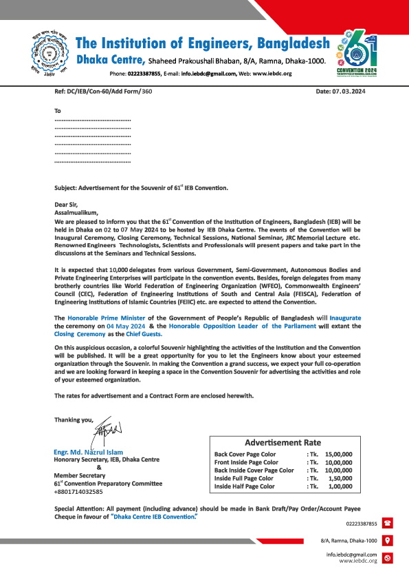 Advertisement for the Souvenir of 61st IEB Convention.